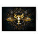 Dessin artistique, symétrique, composition noire et or, ailes d'oiseaux, doré, crâne d'oiseau décoré de motif doré sur arrière - plan sombre, texturé.Style gothique