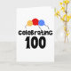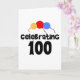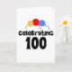 Trois ballons de couleurs primaires et le texte noir qui dit "Celebrating 100" sur les cartes du 100e anniversaire, T-shirts, tasses, et plus.