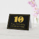 Cette apparence vintage et la conception de la carte de voeux d'anniversaire inspirée de l'époque des années 20 Roaring comprend un grand style art déco inspiré numéro "10", le message "Happy 10th Birthday", un nom modifiable, et un motif de bordure composé de lignes fines sur le devant. L'arrière - plan du devant est noir de couleur. L'intérieur a un message de voeux d'anniversaire personnalisé, ou peut-être peut-être être effacé et laissé vide si un message doit être écrit à la main à la place. Une carte de voeux d’anniversaire personnalisée comme celle-ci pourrait être utilisée pour souligner le dixième anniversaire de quelqu’un. [~Z0000498]