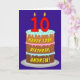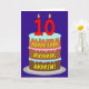 Cette carte de voeux optimiste et joyeuse à thème d'anniversaire présente une représentation d'un gâteau d'anniversaire à trois niveaux avec des bougies en forme de chiffre sur le dessus montrant l'âge "10", avec le message "HAPPY 10TH BIRTHDAY", et un nom de destinataire personnalisé. L'intérieur a un message d'anniversaire personnalisé, ou peut-être peut-être être effacé et laissé vide si un message doit être écrit à la main à la place. Une carte de voeux d’anniversaire joyeuse et personnalisée comme celle-ci pourrait être envoyée pour célébrer le dixième anniversaire de quelqu’un. [~Z0000620]
