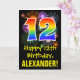 La façade de cette carte de voeux colorée, amusante et passionnante à thème d'anniversaire comporte un grand nombre de "12" ayant un motif inspiré par un gradient de spectre arc-en-ciel. Il comporte également le message "Joyeux 12e anniversaire", ainsi qu'un nom de destinataire personnalisable. Le front a en outre un feu d'artifice coloré de célébrations inspiré des motifs arrière - plans. L'intérieur comporte un message de salutation d'anniversaire modifiable, ou peut-être pourrait-il être effacé et laissé vide si un message doit être écrit à la main à la place. Une carte d’anniversaire personnalisable comme celle-ci pourrait être une façon amusante d’envoyer un message célébrant le douzième anniversaire de quelqu’un. [~Z0000442]