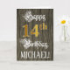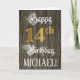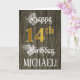 Le recto de cette carte de voeux d'anniversaire formelle et ornée comporte le message "Joyeux 14e anniversaire", ainsi qu'un nom de destinataire personnalisable. Une partie du message est dans un texte élaboré de style script, le grand numéro "14th" présente une imitation/faux motif de look d'inspiration or, et l'arrière - plan a un faux/imitation motif d'inspiration bois. L'intérieur a un message de voeux d'anniversaire customisé, ou peut-être peut-être être effacé et laissé vide si un message doit être écrit à la main à la place. Une carte de voeux d'anniversaire de luxe et personnalisable comme celle-ci pourrait être une façon respectable d'envoyer des voeux d'anniversaire à quelqu'un qui célèbre son quatorzième anniversaire. [~Z0000561]