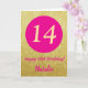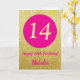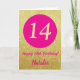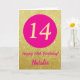14th Happy Birthday Hot Pink et Gold Parties scintillant Card avec nom personnalisé. Pour plus de personnalisation, cliquez sur le bouton "Customiser" et utilisez notre outil de conception pour modifier ce modèle.