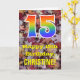 L'avant de cette carte de voeux d'anniversaire colorée, d'inspiration automnale et d'inspiration nature présente un grand nombre de "15" avec un motif inspiré par un gradient de spectre arc-en-ciel, ainsi que le message "Happy 15th Birthday", et un nom personnalisable. L'arrière - plan de l'avant de la carte présente une chute rustique feuilles automne motif. L'intérieur comporte un message de voeux d'anniversaire personnalisable, ou peut-être pourrait-il être effacé et laissé vide si un message doit être écrit à la main à la place. Une carte d’anniversaire personnalisée comme celle-ci pourrait être une façon amusante d’envoyer un message pour célébrer le quinzième anniversaire de quelqu’un. [~Z0000384]