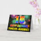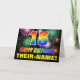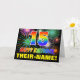 L'avant de cette carte de voeux colorée, joyeuse et amusante sur le thème de l'anniversaire comporte un grand nombre de "15" et le message "HAPPY BANTHDAY", tous deux avec un dégradé de arc-en-ciel inspiré de couleur motif, ainsi qu'un nom de destinataire modifiable jaune en gras. Le devant est également orné d'un motif arrière - plan multicolore inspiré par les feux d'artifice de la fête. L'intérieur comporte un message de voeux d'anniversaire customisé, ou peut-être pourrait-il être effacé et laissé vide si un message doit être écrit à la main à la place. Une carte d’anniversaire personnalisable dynamique comme celle-ci pourrait être une façon amusante de reconnaître le quinzième anniversaire de quelqu’un. [~Z0000471]