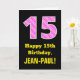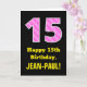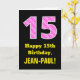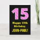 Cette carte de voeux joyeuse et amusante sur le thème de l'anniversaire dispose d'un grand numéro "15" avec un motif à rayures rose clair et rose foncé contenant des formes cardiaques sur le devant. Le recto contient également le message de voeux d'anniversaire "Joyeux 15e anniversaire", ainsi qu'un nom de destinataire personnalisé. L'intérieur comporte un message de voeux d'anniversaire personnalisé, ou peut-être pourrait-il être effacé et laissé vide si un message doit être écrit à la main à la place. Une carte d'anniversaire personnalisée comme celle-ci pourrait être une façon amusante d'envoyer des voeux d'anniversaire à quelqu'un qui célèbre son quinzième anniversaire. [~Z0000434]