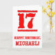 Ce design amusant de carte de voeux d'anniversaire comporte un grand numéro rouge "17" avec un look inspiré par un tampon en caoutchouc, ainsi que le message de voeux d'anniversaire "HAPPY BANTHDAY", et un nom personnalisé sur le devant. L'intérieur a un message de voeux d'anniversaire customisé, ou peut-être peut-être être effacé et laissé vide si un message doit être écrit à la main à la place. Une carte de voeux d'anniversaire personnalisée et amusante comme celle-ci pourrait être une façon amusante de transmettre un message d'anniversaire à quelqu'un qui célèbre son dix-septième anniversaire. [~Z0000524]