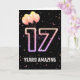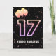 Ballons de fête et confettis sur arrière - plan noir avec le néon numéro 17 pour 17ème anniversaire.