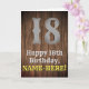 Ce style américain de l'Ancien Ouest inspiré de l'American Wild West et de l'aspect champêtre de la conception de carte de voeux d'anniversaire comporte un grand numéro de look rustique "18", le message "Happy 18th Birthday", un nom personnalisé, et un faux/imitation grain de bois inspiré look motif arrière - plan. L'intérieur a un message de voeux d'anniversaire personnalisé, ou peut-être peut-être être effacé et laissé vide si un message doit être écrit à la main à la place. Une carte de voeux d'anniversaire customisée comme celle-ci pourrait être une façon amusante de livrer des voeux d'anniversaire à quelqu'un qui célèbre son dix-huitième anniversaire. [~Z0000469]
