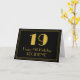 Cette carte d'anniversaire de style Roaring '20's inspiré et vintage design dispose d'un grand style art déco inspiré numéro "19", le message "Happy 19th Birthday," un nom personnalisable, et un motif de bordure composé de lignes fines sur le devant. L'arrière - plan du devant est noir de couleur. L'intérieur a un message de voeux d'anniversaire modifiable, ou peut-être peut-être être effacé et laissé vide si un message doit être écrit à la main à la place. Une carte de voeux d'anniversaire personnalisée comme celle-ci pourrait être une façon amusante de délivrer des voeux d'anniversaire à quelqu'un qui célèbre son dix-neuvième anniversaire. [~Z0000463]
