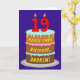 La façade de cette carte de voeux amusante et optimisée à thème d'anniversaire présente une représentation d'un gâteau d'anniversaire à trois niveaux avec des bougies en forme de numéro sur le dessus montrant l'âge "19", avec le message "HAPPY 19TH BIRTHDAY", et un nom de destinataire modifiable. L'intérieur a un message de voeux d'anniversaire modifiable, ou peut-être peut-être être effacé et laissé vide si un message doit être écrit à la main à la place. Une carte de voeux d’anniversaire joyeuse et personnalisée comme celle-ci pourrait être envoyée pour célébrer le dix-neuvième anniversaire de quelqu’un. [~Z0000620]