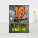 La face avant de cette carte d'anniversaire sur le thème d'Halloween effrayant et terrifiant comporte un grand nombre « 19 » et le message « JOYEUX ANNIVERSAIRE », ainsi qu'un nom personnalisé. Il y a aussi des représentations d'une chauve-souris et d'un fantôme sur le devant. L'intérieur comporte un message d'anniversaire personnalisé, ou pourrait éventuellement être effacé et laissé en blanc si un message doit être écrit à la main à la place. Une carte d'anniversaire comme celle-ci pourrait être un moyen amusant d'envoyer des vœux d'anniversaire à quelqu'un qui célèbre son dix-neuvième anniversaire et qui est également né le 31 octobre (Halloween).