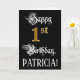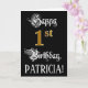 L'avant de cette carte de voeux élégante et luxueuse à thème d'anniversaire comporte le message "Joyeux 1er anniversaire", ainsi qu'un nom de destinataire personnalisé. Une partie du message est dans un texte de style script sophistiqué, le grand numéro "1st" a un faux/imitation motif de look d'inspiration or, et l'arrière - plan est coloré noir. L'intérieur a un message de voeux d'anniversaire personnalisable, ou peut-être peut-être être effacé et laissé vide si un message doit être écrit à la main à la place. Une carte de voeux d'anniversaire formelle et personnalisée comme celle-ci pourrait être une façon respectable d'envoyer des voeux d'anniversaire à quelqu'un qui célèbre son premier anniversaire. [~Z0000559]