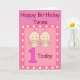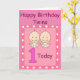 Carte d'anniversaire rose fille pour votre premier anniversaire spécial de petite fille jumelle. Sur le devant se trouve un grand numéro 1 rose avec un contour pourpre. A côté de celle-ci se trouvent deux petits jumeaux dans une nappie blanche et un grand sourire. Cette jolie photo est dans un cadre rose avec des coeurs d'amour blancs tout le long. Au-dessus se trouvent les mots "Joyeux Jumeaux d'anniversaire en lettres rose foncé. À l'intérieur sont les mots, "Souhaiter à nos petites filles spéciales un anniversaire très heureux" Tout est dans un modèle que vous pouvez supprimer ou changer à votre propre texte.