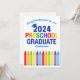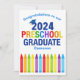 Cette adorable carte de graduation maternelle 2024 présente un casquette cool au-dessus de l'écriture colorée et une rangée de crayons en arc-en-ciel. Mignonne carte de félicitations pour les diplômés Pré-K personnalisable en couleurs amusantes pour votre préscolaire avec le nom de votre enfant personnalisé en bleu. Félicitations à notre diplômée PreK !
