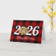 Arc cadeau or sur bison rouge et noir plaid arrière - plan pour 2025 Joyeux Noël.