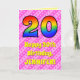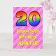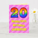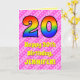 L'avant de cette carte de voeux festive et joyeuse de 20e anniversaire a un grand nombre de "20" avec un motif coloré du spectre arc-en-ciel inspiré du gradient. Il comporte également le message "Joyeux 20e anniversaire", ainsi qu'un nom de destinataire personnalisé. L'arrière - plan de l'avant est doté d'un motif amusant de rayures rose foncé et rose pâle contenant des coeurs roses aimés. L'intérieur comporte un message de voeux d'anniversaire personnalisé, ou peut-être pourrait-il être effacé et laissé vide si un message doit être écrit à la main à la place. Une carte d'anniversaire personnalisable comme celle-ci pourrait être une façon amusante d'envoyer des voeux d'anniversaire à quelqu'un qui célèbre son vingtième anniversaire. [~Z0000416]