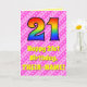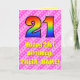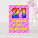 L'avant de cette carte de voeux joyeuse et amusante de 21e anniversaire de conception comporte un grand numéro "21" avec un motif coloré inspiré par l'aspect d'un arc-en-ciel spectre. Il comporte également le message "Joyeux 21e anniversaire", suivi d'un nom de destinataire personnalisé. L'arrière - plan de l'avant est doté d'un motif à rayures rose foncé et rose clair, aux coeurs roses aimés. L'intérieur comporte un message de voeux d'anniversaire modifiable, ou peut-être pourrait-il être effacé et laissé vide si un message doit être écrit à la main à la place. Une carte d’anniversaire personnalisable comme celle-ci pourrait être une façon amusante de reconnaître le vingt et unième anniversaire de quelqu’un. [~Z0000416]