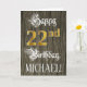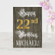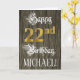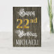 L'avant de cette élégante et élégante carte de voeux thématique d'anniversaire comporte le message "Happy 22nd Birthday", et un nom de destinataire modifiable. Une partie du message est dans un texte élaboré de style script, le grand numéro "22e" présente un faux/imitation motif de look d'inspiration or, et l'arrière - plan a une imitation/faux motif d'inspiration bois. L'intérieur a un message de voeux d'anniversaire customisé, ou peut-être peut-être être effacé et laissé vide si un message doit être écrit à la main à la place. Une carte de voeux d'anniversaire luxueuse et modifiable comme celle-ci pourrait être un moyen respectable de transmettre un message d'anniversaire à quelqu'un qui célèbre son vingt-deuxième anniversaire. [~Z0000561]