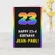 Cette carte de voeux dynamique et amusante sur le thème de l'anniversaire comporte un grand nombre de "23" avec un motif multicolore à spectre arc-en-ciel inspiré par dégradé, avec le message "HAPPY 23rd BIRTHDAY,", et un nom de destinataire personnalisé. L'intérieur comporte un message de voeux d'anniversaire modifiable, ou peut-être pourrait-il être effacé et laissé vide si un message doit être écrit à la main à la place. Une carte de voeux d'anniversaire optimiste et customisée comme celle-ci pourrait être une façon amusante de faire des voeux d'anniversaire à quelqu'un qui célèbre son vingt-troisième anniversaire. [~Z0000636]