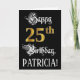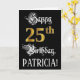 La façade de cette somptueuse et luxueuse carte de voeux d'anniversaire comporte le message "Joyeux 25e anniversaire", ainsi qu'un nom de destinataire personnalisé. Une partie du message est dans un texte de style script sophistiqué. Le grand numéro "25th" présente un motif d'apparence d'inspiration or imitation ou fausse. L'arrière - plan est noir de couleur. L'intérieur a un message de voeux d'anniversaire personnalisable, ou peut-être peut-être être effacé et laissé vide si un message doit être écrit à la main à la place. Une carte de voeux d’anniversaire ornée et personnalisable comme celle-ci pourrait être utilisée pour souligner le vingt-cinquième anniversaire de quelqu’un. [~Z0000559]
