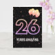 Ballons de fête et confettis sur arrière - plan noir avec le néon numéro 26 pour un 26ème anniversaire.