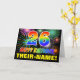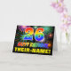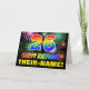 La façade de cette carte de voeux amusante, colorée et joyeuse sur le thème de l'anniversaire comporte un grand nombre de "26" et le message "HAPPY BANTHDAY", tous deux avec un dégradé de arc-en-ciel inspiré coloré motif, ainsi qu'un nom de destinataire personnalisé jaune gras. Le devant est également orné d'un motif arrière - plan multicolore inspiré par l'apparition de feux d'artifice festifs éclatants. L'intérieur comporte un message de voeux d'anniversaire customisé, ou peut-être pourrait-il être effacé et laissé vide si un message doit être écrit à la main à la place. Une carte d’anniversaire personnalisable dynamique comme celle-ci pourrait être une façon amusante d’envoyer un message célébrant le vingt-sixième anniversaire de quelqu’un. [~Z0000471]