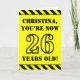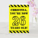 L’avant de cette carte de voeux audacieuse et attirant l’attention sur le thème de l’anniversaire comporte un nom personnalisé et le message "VOUS AVEZ MAINTENANT 26 ANS!" en texte de pochoir noir sur un arrière - plan de couleur jaune. L'avant est également orné d'un motif rayé jaune et noir accrocheur aux bords supérieur et inférieur. L'intérieur comporte un message d'anniversaire personnalisé, ou pourrait être effacé et laissé vide si un message doit être écrit à la main à la place. Une carte d’anniversaire personnalisable comme celle-ci pourrait être une façon amusante de reconnaître le vingt-sixième anniversaire de quelqu’un. [~Z0000413]