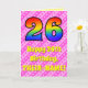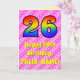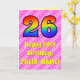L'avant de cette carte de voeux de 26ème anniversaire, optimisée et amusante, est dotée d'un grand nombre de "26", dont le motif dégradé est inspiré du spectre arc-en-ciel coloré. Il contient également le message "Joyeux 26e anniversaire", suivi d'un nom de destinataire personnalisé. L'arrière - plan de l'avant est doté d'un motif de rayures rose foncé et rose clair, aux coeurs roses aimés. L'intérieur comporte un message de voeux d'anniversaire personnalisé, ou peut-être pourrait-il être effacé et laissé vide si un message doit être écrit à la main à la place. Une carte d'anniversaire personnalisable comme celle-ci pourrait être une façon amusante d'envoyer des voeux d'anniversaire à quelqu'un qui célèbre son vingt-sixième anniversaire. [~Z0000416]