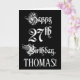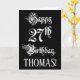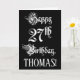 La façade de cette somptueuse carte de voeux à thème d'anniversaire comporte le message "Joyeux 27ème anniversaire", en texte de script sophistiqué, sur un arrière - plan de couleur noire. L'intérieur a un message d'anniversaire personnalisé, ou peut-être peut-être être effacé et laissé vide si un message doit être écrit à la main à la place. Une carte de voeux d’anniversaire luxueuse et modifiable comme celle-ci pourrait être envoyée pour célébrer le vingt-septième anniversaire de quelqu’un. [~Z0000554]