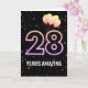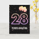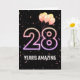 Ballons de fête et confettis sur arrière - plan noir avec le néon numéro 28 pour un 28ème anniversaire.