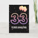 Ballons de fête et confettis sur arrière - plan noir avec le néon numéro 33 pour un 33ème anniversaire.