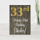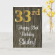 Cette conception élégante, sophistiquée et luxueuse de carte de voeux d'anniversaire comprend un grand numéro ordinal "33ème" avec un motif dégradé d'inspiration fausse/imitation or, plus le message de voeux d'anniversaire "Happy 33ème anniversaire", et un nom personnalisable dans une police de style script sur le devant. L'arrière - plan du devant a un motif d'inspiration imitation bois. L'intérieur a un message de voeux d'anniversaire personnalisable, ou peut-être peut-être être effacé et laissé vide si un message doit être écrit à la main à la place. Une carte de voeux customisée comme celle-ci pourrait servir à célébrer le trente-troisième anniversaire de quelqu’un. [~Z0000519]