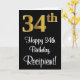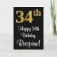 Cette carte de vœux d'anniversaire sophistiquée, luxueuse et élégante présente un grand nombre ordinal « 34e » avec un motif de dégradé imitant l'or, ainsi que le message de vœux d'anniversaire « Joyeux 34e Anniversaire » et un nom personnalisable dans une police de caractère script sur le devant. Elle a également un fond de couleur noire sur le devant. L'intérieur contient un message de vœux d'anniversaire modifiable, ou pourrait éventuellement être vidé et laissé vierge si un message doit être écrit à la main à la place. Une carte de vœux d'anniversaire personnalisée et élégante comme celle-ci pourrait être un moyen amusant d'envoyer des vœux d'anniversaire à quelqu'un qui célèbre son trente-quatrième anniversaire.