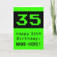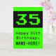 This fun and nerdy birthday-themed greeting card design features a large green retro computer gaming style number "35" on the front. It also features the birthday greeting message "Happy 35th Birthday,", and a name that can be personalized. The inside features a customizable birthday greeting message, or could perhaps be cleared and left blank if a message is to be written by hand instead. A silly birthday greeting card like this might be used to send a birthday greeting message in honor of the thirty fifth birthday of a computer programmer, a computer system administrator, or somebody who APPeciates retro video games. [~Z0000430]