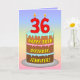 Cette carte de voeux amusante et attrayante, sur le thème de l'anniversaire, présente une représentation en bande dessinée d'un gâteau d'anniversaire à trois niveaux, avec des bougies en forme de chiffre sur le dessus montrant l'âge de "36 ans", ainsi que le message "HAPPY 36TH BIRTHDAY", et un nom de destinataire modifiable. L'arrière - plan de l'avant dispose d'un motif multicolore pastel en arc-en-ciel inspiré du spectre dégradé. L'intérieur a un message de voeux d'anniversaire modifiable, ou peut-être peut-être être effacé et laissé vide si un message doit être écrit à la main à la place. Une carte de voeux d'anniversaire joyeuse et modifiable comme celle-ci pourrait être une façon amusante de délivrer des voeux d'anniversaire à quelqu'un qui célèbre son trente-sixième anniversaire. [~Z0000625]
