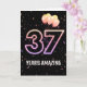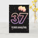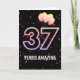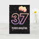 Ballons de fête et confettis sur arrière - plan noir avec le néon numéro 37 pour un 37ème anniversaire.