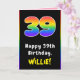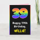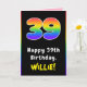 Cette carte de voeux d'anniversaire audacieuse et joyeuse comporte le numéro "39" avec un motif dégradé multicolore inspiré du spectre arc-en-ciel, ainsi que le message "Joyeux 39e anniversaire", et un nom de destinataire personnalisé. L'intérieur comporte un message de voeux d'anniversaire personnalisé, ou peut-être pourrait-il être effacé et laissé vide si un message doit être écrit à la main à la place. Une carte de voeux amusante et personnalisable comme celle-ci pourrait être envoyée pour célébrer le trente-neuvième anniversaire de quelqu’un. [~Z0000627]