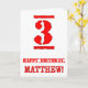 Cette carte de voeux amusante à thème d'anniversaire comporte un grand numéro rouge "3" avec un look inspiré par un tampon en caoutchouc, ainsi que le message de voeux d'anniversaire "HAPPY BANTHDAY", et un nom personnalisable sur le devant. L'intérieur a un message de voeux d'anniversaire modifiable, ou peut-être peut-être être effacé et laissé vide si un message doit être écrit à la main à la place. Une carte de voeux amusante customisée comme celle-ci pourrait être utilisée pour célébrer le troisième anniversaire de quelqu’un. [~Z0000524]