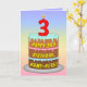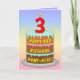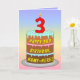 Cette carte de voeux d'anniversaire joyeuse et colorée présente une représentation de type dessin animé d'un gâteau d'anniversaire à trois niveaux avec une bougie en forme de chiffre sur le dessus montrant le numéro "3", avec le message "HAPPY 3RD BIRTHDAY", et un nom de destinataire personnalisable. L'arrière - plan de l'avant a un motif multicolore pastel en arc-en-ciel inspiré du spectre dégradé. L'intérieur comporte un message de voeux d'anniversaire personnalisé, ou peut-être pourrait-il être effacé et laissé vide si un message doit être écrit à la main à la place. Une carte de voeux d'anniversaire amusante et personnalisée comme celle-ci pourrait être une façon amusante d'envoyer des voeux d'anniversaire à quelqu'un qui célèbre son troisième anniversaire. [~Z0000625]