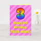 L'avant de cette carte de voeux festive et joyeuse de 3ème anniversaire de conception a un grand numéro "3" avec un motif coloré à l'arc-en-ciel inspiré du spectre dégradé. Il contient également le message "Joyeux 3e anniversaire", suivi d'un nom de destinataire personnalisé. L'arrière - plan de l'avant présente un joyeux motif de rayures rose foncé et rose clair, aux coeurs roses aimés. L'intérieur comporte un message de voeux d'anniversaire personnalisé, ou peut-être pourrait-il être effacé et laissé vide si un message doit être écrit à la main à la place. Une carte d’anniversaire personnalisée comme celle-ci pourrait être une façon amusante de reconnaître le troisième anniversaire de quelqu’un. [~Z0000416]