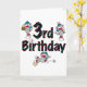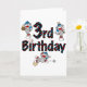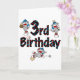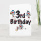 Trois petits singes chaussettes en casquettes de baseball bleu lancent, glissent, et à la batte sur notre Sock Monkey Baseball 3ème anniversaire design avec des singes chaussettes et texte cool qui dit "3ème Brithday".