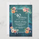 Turquoise et bleu marine grunge-texturé 40e anniversaire invitation de fête ("40 et fabuleux") avec délicat rose et pêche floral. L'arrière de cette invitation est un motif en diagonale turquoise et blanc rayé.