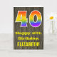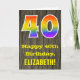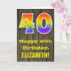 L'avant de cette carte de voeux colorée mais rustique à thème d'anniversaire dispose d'un grand nombre de "40" avec un motif inspiré par un dégradé de l'arc-en-ciel. Il comporte également le message "Joyeux 40e anniversaire", et un nom de destinataire personnalisé. L'avant est ornée d'un arrière - plan représentant un motif rustique d'inspiration simili-bois. L'intérieur comporte un message de voeux d'anniversaire personnalisé, ou peut-être pourrait-il être effacé et laissé vide si un message doit être écrit à la main à la place. Une carte d’anniversaire personnalisable comme celle-ci pourrait être une façon amusante de célébrer le quarantième anniversaire de quelqu’un. [~Z0000419]