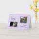 Sur un arrière - plan lilas pâle avec un motif répétitif des années 40, cette carte peut être personnalisée avec votre propre texte et photos pour faire un salut de 40e anniversaire très spécial. Il y a deux espaces pour vos photos sur le devant. L'une est rectangulaire, l'autre est carré. Chaque photo a une étroite bordure blanche et un 'cadre' violet foncé. Le texte ci-joint est en violet assorti. On y lit actuellement : "De petits débuts... ...40 ans en préparation", ou vous pouvez modifier ceci pour convenir. L'accueil à l'intérieur est un simple "Joyeux 40ème anniversaire" mais vous pouvez aussi substituer votre propre salutation selon vos besoins. [Photographie © Storytree Studios, Stanford, Californie]