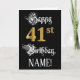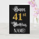 L'avant de cette conception de carte d'anniversaire luxueuse et somptueuse présente le message « Joyeux 41e anniversaire », ainsi que le nom personnalisé du destinataire. Une partie du message est dans un texte de style calligraphié élaboré, le grand nombre « 41e » présente un motif d'apparence dorée fausse/imitée, et le fond est de couleur noire. L'intérieur comporte un message d'anniversaire personnalisé ou pourrait éventuellement être laissé vierge si un message doit être écrit à la main à la place. Une carte d'anniversaire élégante et personnalisée comme celle-ci pourrait être un moyen respectable d'envoyer un message d'anniversaire à quelqu'un qui célèbre son quarante et unième anniversaire.