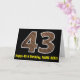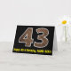 La façade de cette carte de voeux rustique et amusante d'anniversaire avec un grand numéro "43" avec un motif d'apparence inspiré du grain de bois, avec le message "Happy 43rd Birthday," et un nom modifiable. L'intérieur comporte un message de voeux d'anniversaire personnalisé, ou peut-être pourrait-il être effacé et laissé vide si un message doit être écrit à la main à la place. Une carte d’anniversaire personnalisée comme celle-ci pourrait être une façon amusante d’envoyer un message pour célébrer le quarante-troisième anniversaire de quelqu’un. [~Z0000431]