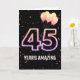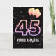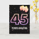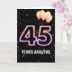 Ballons de fête et confettis sur arrière - plan noir avec le néon numéro 45 pour un 45ème anniversaire.