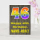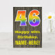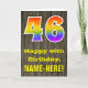 L'avant de cette conception de carte de vœux d'anniversaire colorée mais rustique présente un grand nombre "46" ayant un motif inspiré d'un dégradé de spectre d'arc-en-ciel. Il comporte également le message "Joyeux 46ème Anniversaire," et un nom de destinataire personnalisé. L'arrière-plan de l'avant de la carte présente un motif inspiré d'un grain de bois faux rustique. L'intérieur comporte un message de vœux d'anniversaire personnalisé, ou pourrait éventuellement être laissé en blanc si un message doit être écrit à la main à la place. Une carte d'anniversaire personnalisable comme celle-ci pourrait être un moyen amusant d'envoyer un message pour célébrer le quarante-sixième anniversaire de quelqu'un. [~Z0000419]