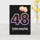 Ballons de fête et confettis sur arrière - plan noir avec le néon numéro 48 pour un 48ème anniversaire.